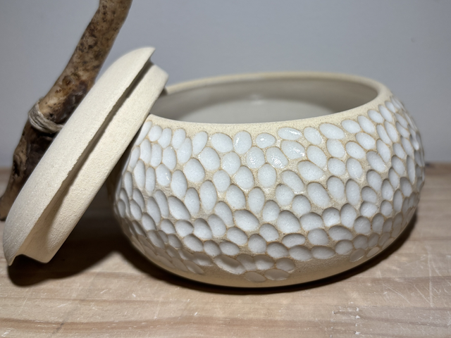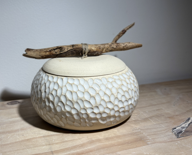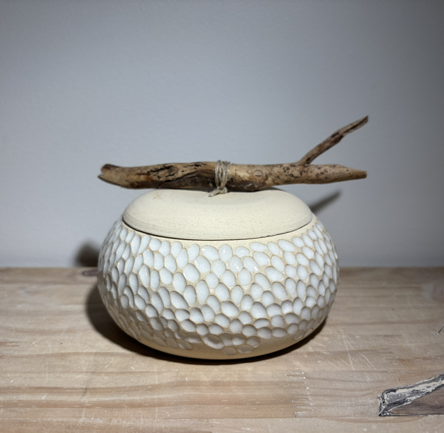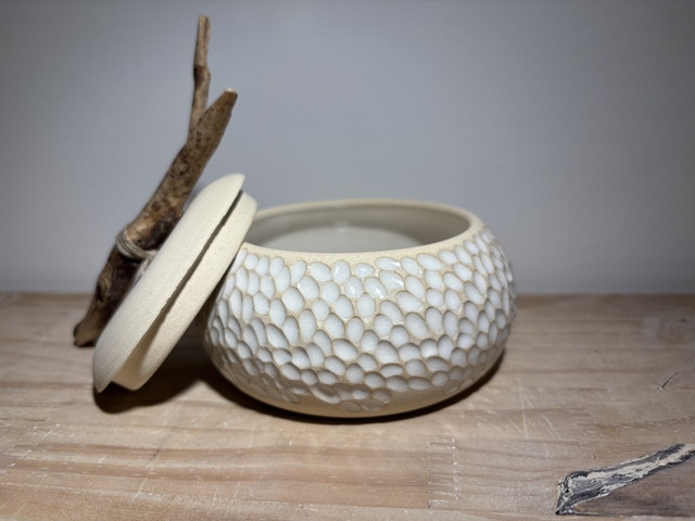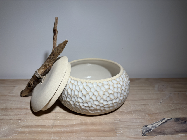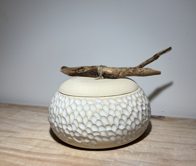 Voici une très jolie boîte à bijoux en grès blanc réalisée sur le tour de potier, puis minutieusement sculptée à la main la rendant ainsi unique.Elle sera par la suite émaillée, puis agrémentée d'un bois flotté en guise de poignet pour le couvercle.Un émail blanc a été appliqué sur le contenant ; le couvercle resté brute pour un effet très épuré.Imaginée comme boîte à bijoux, chacun pourra lui donner une toute autre fonction ou tout simplement un objet décoratif original.