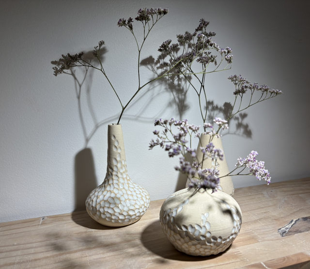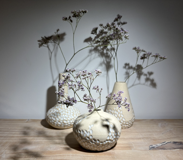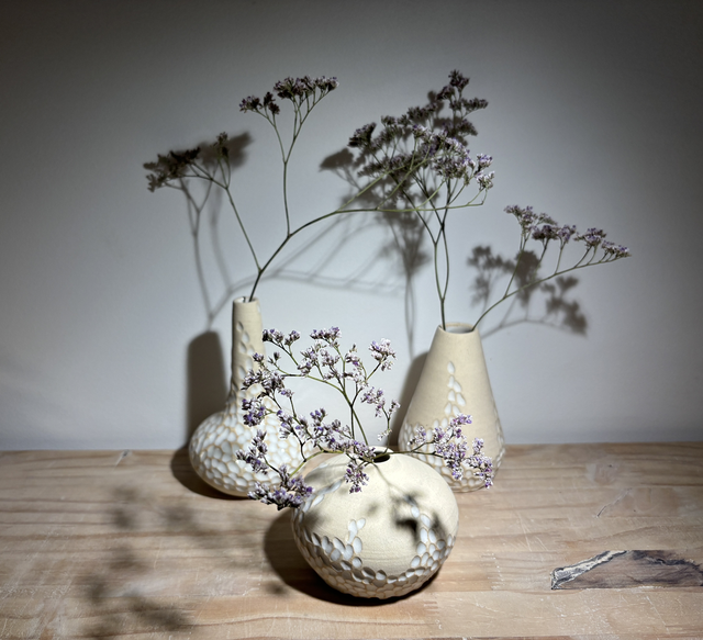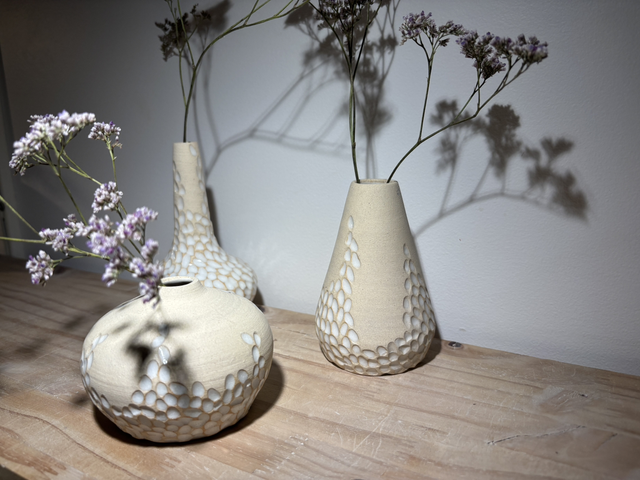 Collection de soliflores en grès blanc réalisés sur le tour de potier, puis minutieusement sculptés à la main les rendant ainsi tous uniques.Ils seront par la suite émaillés pour leur étanchéité.Un émail blanc avec des zones laissées brutes pour un côté très épuré ; chaque soliflore trouvera sa place dans un intérieur.