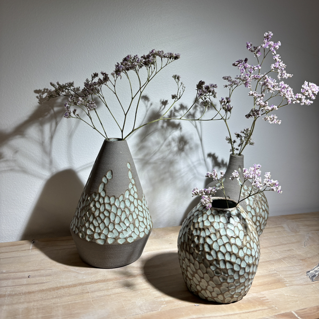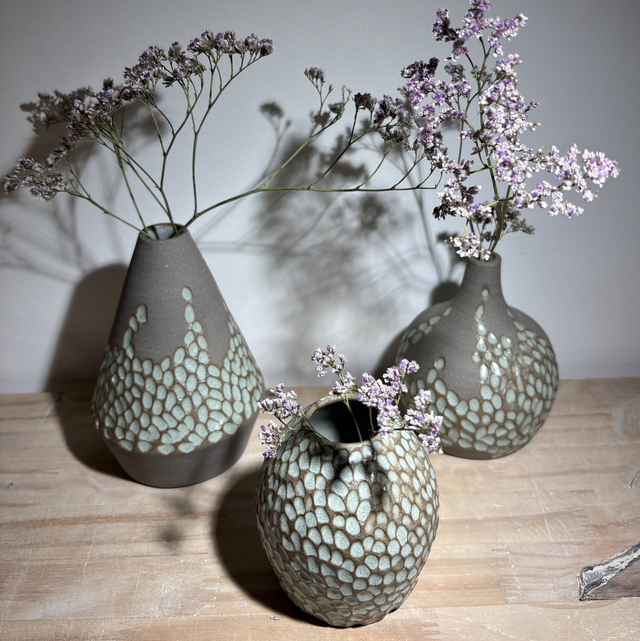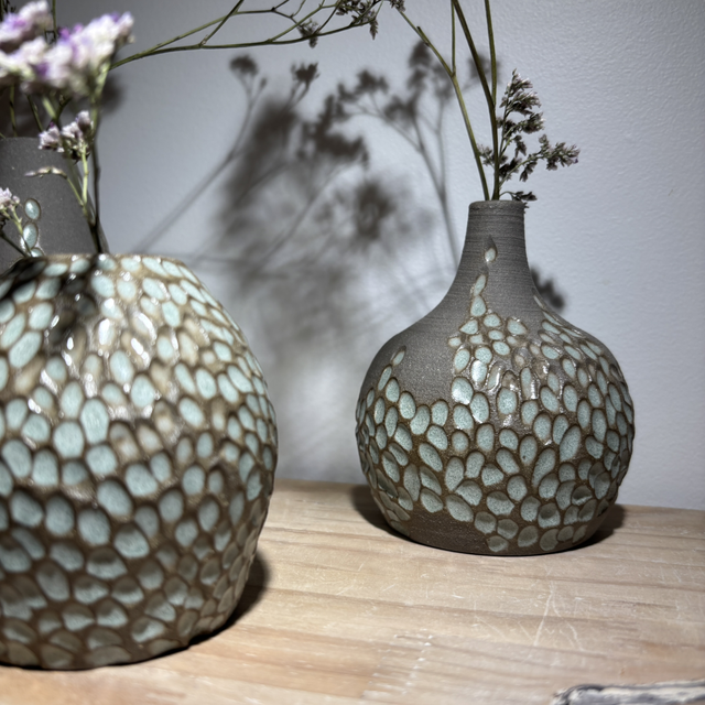 Collection de soliflores en grès blanc réalisés sur le tour de potier, puis minutieusement sculptés à la main les rendant ainsi tous uniques.Ils seront par la suite émaillés pour leur étanchéité.Un émail verts d’eau avec des zones laissées brutes pour un côté très épuré ; chaque soliflore trouvera sa place dans un intérieur.